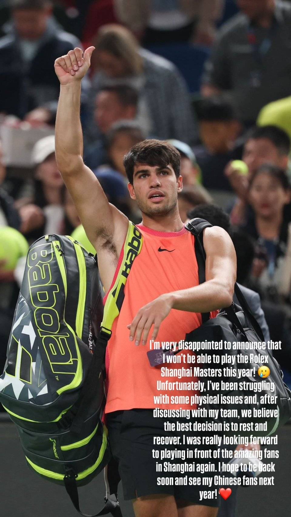 阿尔卡拉斯在自己的社媒写道:“非常遗憾的宣布,今年我将无法参加上海大师赛的比赛。不幸的是,我一直在与一些身体问题作斗争。在同团队讨论之后,我们认为当下最好的决定是休息和恢复。我真的很期待再次在上海面对那些令人惊叹的球迷,希望我能尽快回归,并在明年见到我的中国粉丝们。”