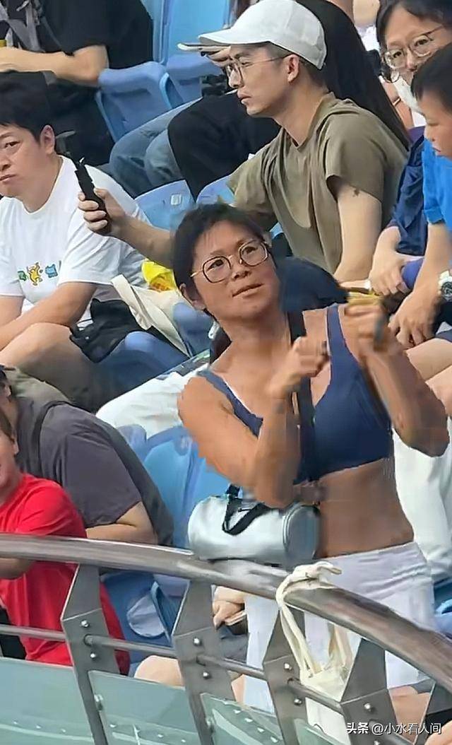 一位带着混血小朋友的女子坐在第一排,离比赛球场和裁判的位置都非常近,这是个看球的绝佳位置。