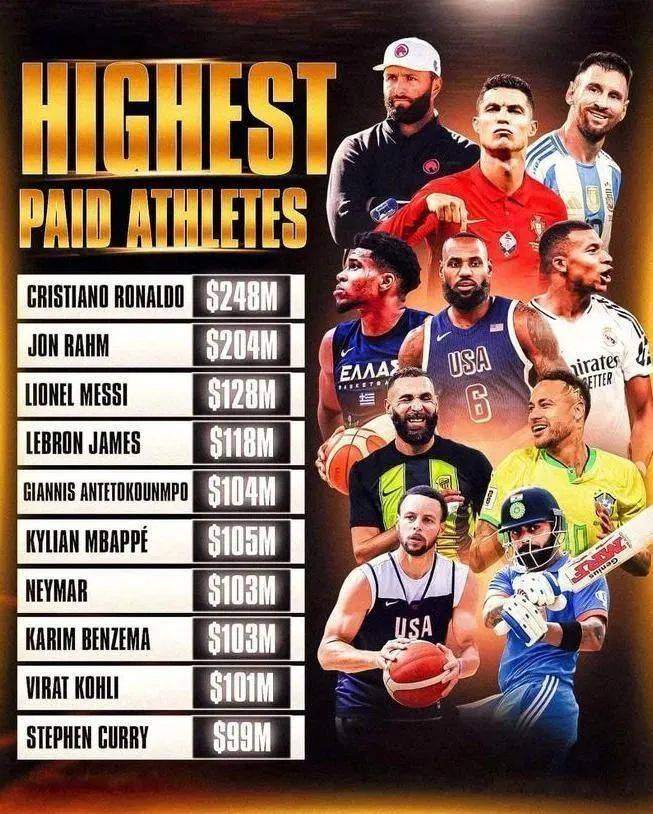 福布斯发布最新一期运动员收入榜,C罗以2.48亿欧元排名榜首,共有五名足球运动员进入前十。高尔夫运动员琼·拉姆以2.04亿欧元排名第二,梅西以1.28亿欧元位列第三。詹姆斯、字母哥、姆巴佩、内马尔、本泽马、维拉·哥利和库里分列四到十位。