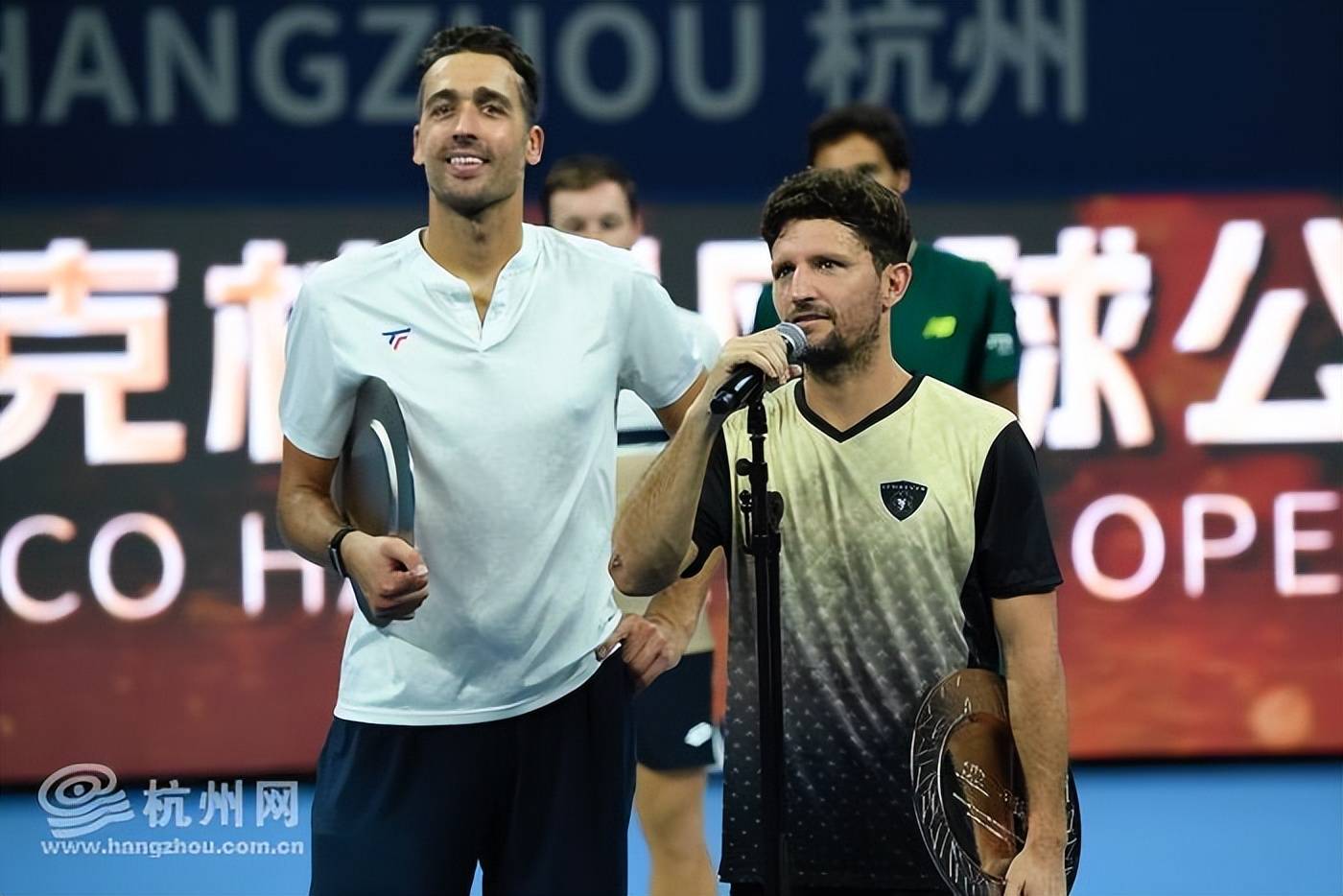 颁奖仪式上,卡布拉尔和米德勒均认为,这是两人第一次来到杭州参赛,一个星期的杭州之旅真的就是一场梦幻之旅。相当感谢杭州网球公开赛的每一位工作人员,感谢赞助商,感谢自己的搭档和团队,感谢对手,也感谢到场和在消息镜头前的每一位观众,是大家共同的砥砺让这项赛事如此成功。米德勒说。卡布拉尔则认为,在获得了这份冠军荣誉之后,他和搭档将更有动力再来杭州,期待卫冕,同时这个冠军也给他们接下来的东京之旅增添了更多信心,感谢大家在工作日的下午来到这里为我们加油。你们的出现是我们砥砺的动力,让我们能够更好地发挥水平,为你们上演一次真正意义上的巅峰对决,谢谢你们的关注。