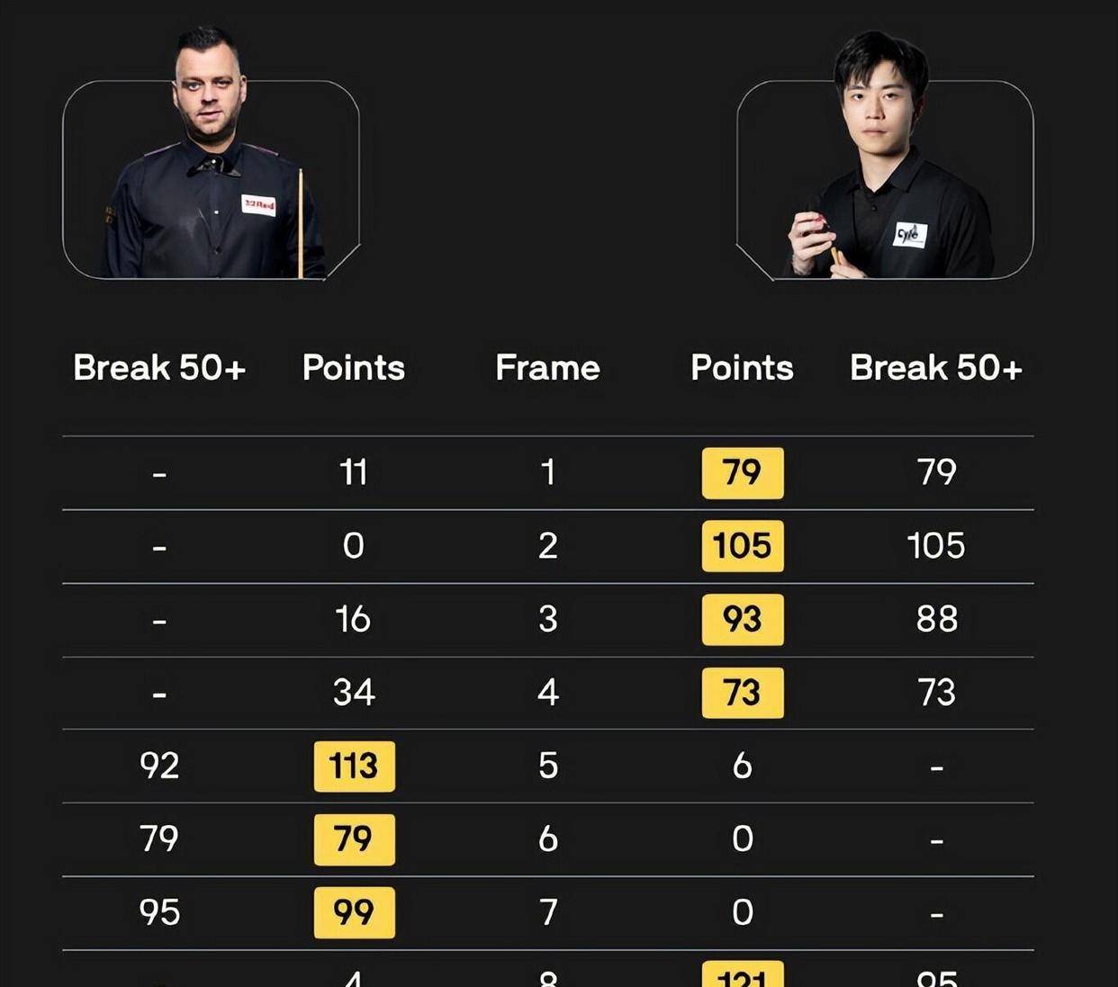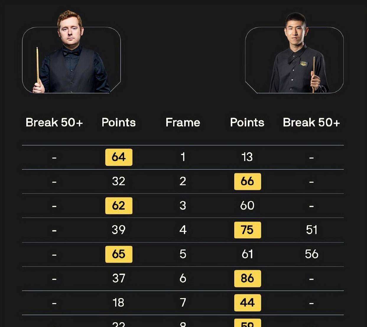 姚朋成与沃拉斯顿的对决同样扣人心弦。 双方前六局战成3-3平,其中第五局姚朋成在打出单杆56分的情况下被对手65-61逆转。 但他顶住压力连赢两局,最终以5-3爆冷晋级。